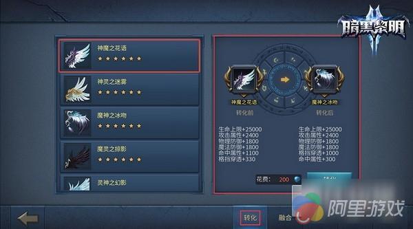 当玩家拥有融合后的6星翅膀时,就可以使用翅膀转化功能。融合后的翅膀可以通过转化功能切换主副属性,以满足玩家在不同战斗环境的不同需求。转化后的翅膀属性主要是主副翅膀独有属性的调整。需要十分注意的是如果转化的翅膀已经拥有,将会被分解为碎片。