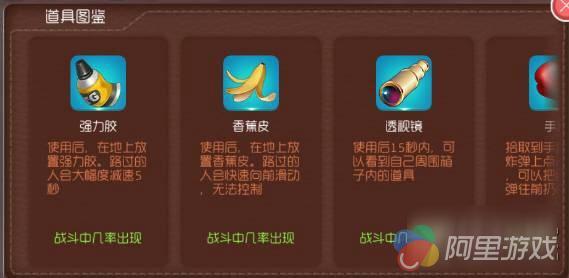 强力胶:在地上放置强力胶,路过的人会大幅度减速 5 秒;香蕉皮:在地上放置香蕉皮,路过的人会快速向前滑动,无法控制;透视镜:使用后 15 秒内,可以看到自己周围箱子内的道具;