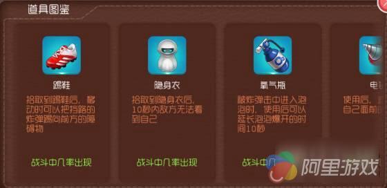 踢鞋:拾取到踢鞋后,移动时可以把挡路的炸弹踢向前方的障碍物;隐身衣:拾取到隐身衣后,10 秒内敌方无法看到自己;氧气瓶:被炸得集中进入泡泡时,使用后可以延长泡泡爆开的时间10秒,每场战斗只能使用 1 次;电钻:直接摧毁自己面前的障碍。
