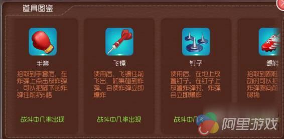 手套:在炸弹上点击放炸弹的按钮,可以把脚下的炸弹往前扔 6 格;飞镖:飞镖往前废除,如果碰到炸弹,会使炸弹立刻爆炸;钉子:在地上放置钉子,钉子上放置炸弹,炸弹会立刻爆炸;