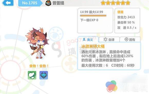 奥义·冰淇淋特大桶:洒出元素冰淇淋,直接命中造成60%伤害,黏在地上后造成120%的伤害,冰淇淋数量数量增加4个。