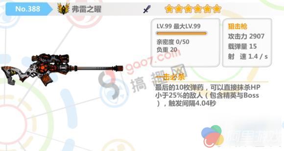 全神器中面板最高的狙,同时也是全神器中载弹量最低的狙,技能能秒杀血量少于25%的怪包括boss与精英,看似很美好,然而存在诸多限制,首先居然是载弹量小于10,简直是在XX,当前版本武器要么是满弹药,要么是0弹药,对于狙击这种发枪超慢的装备居然还搞这种限制,实用性直接大打折扣其次再是4.04s超长的触发间隔,最后再看,怪的血量要求要在25%以下才能触发,同是斩杀类装备,奴役、领域之流强过它太多。