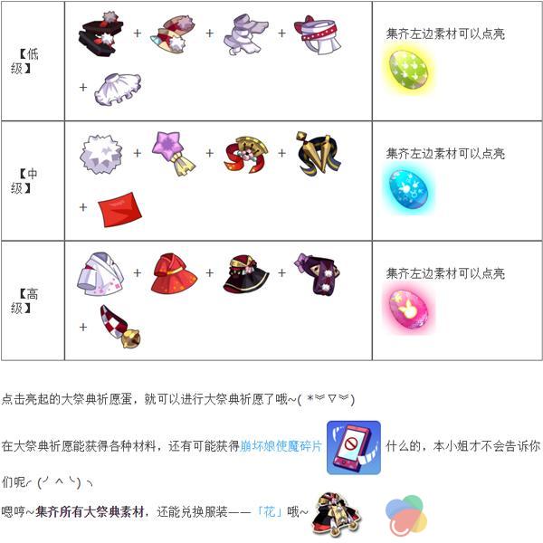 上面列出的这些大祭典素材,在关卡选择页面开启的各个活动中都有可能获得~(^∀^●)ノシ快去寻找一下吧!素材们除了在各活动的积分奖励中获取,在部分关卡也会有掉落哦~低级素材在:崩坏侦探少女关卡、喵王紧急活动关、中级双周boss、3~8村剧情关卡里有几率掉落中级素材在:崩坏侦探少女关卡、雾海庄园、曜日关、喵货紧急活动关、高级和超级双周boss、9~14村剧情关卡里有几率掉落高级素材在:迷路修女关卡、雾海庄园、世界BOSS、喵神紧急活动关、地狱级双周boss、15~18村剧情关卡里有几率掉落另外,在大祭典期间,世界boss的开启时间将暂时改动,并且传颂门中的双周boss不产出大祭典素材,米娜桑注意一下哦~在大祭典还会有积分排行~︿( ̄︶ ̄)︿根据积分和排行还会有奖励什么的呢!具体奖励以页面显示为准哦~大祭典积分是由获得的素材数量来决定的,获得素材即获得积分,素材消耗掉不会扣积分,每种素材获得的积分值不一样。特别说明:活动结束后,大祭典的素材会被伦家回收哦~注意一下