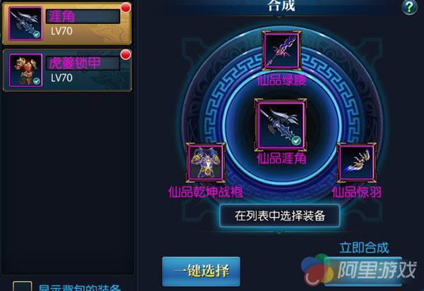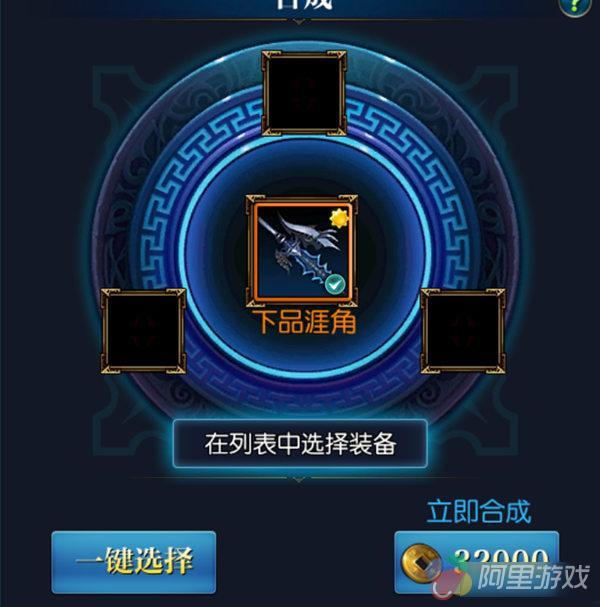 如图所示,同等紫色装备也能合成橙色装备,装备合成也不是一定成功,失败了周围的三件装备就会消失,中间装备不变。