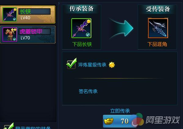 3)传承:传承功能可以让你把前面升过星的装备,完美的传承的下一件装备上面,这样前面大家就可以放心的淬炼武器和衣服了,传承的成功率为100%