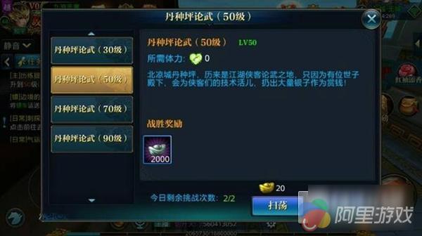每天可以挑战两次,30 级的丹种坪论武通过就可以获取 1200 银币了,懒得去打还可以使用 20 金子扫荡,这个比摇钱树值多了。随着等级 50 级,70 级,90 级,还会开启更高奖励的关卡。所以努力提升等级吧