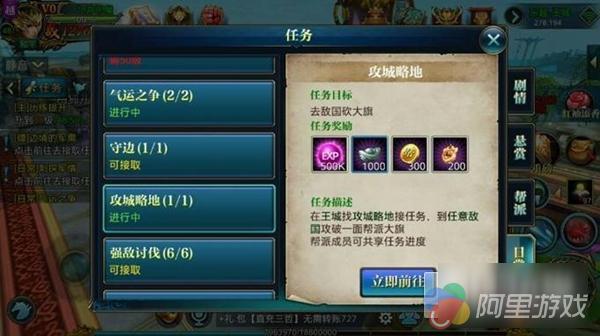 需要 40 级且加入帮派才可以做,每天只能做一次,到王城接取任务,到任意敌国砍倒一面大旗就可以完成了,帮派成员可以共享进度,完成后就可以获取银币奖励。