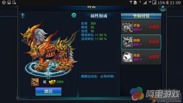 麒麟时装,属性加成,生命+300.物攻+30.法攻+30.物攻转化11%.法攻转化11%,麒麟时装威武霸气,胯下麒麟,千离厮杀,一站即达,价格2560金子。