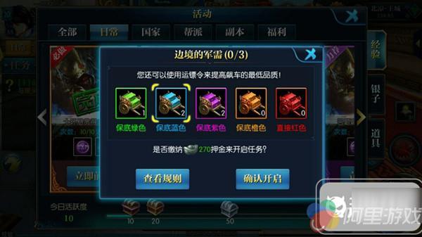 2.运镖令,在运镖开始时候,玩家可以使用运镖令来改变镖车的等级,改变镖车等级并不会提高押金,但会提高任务奖励,镖车按等级分为分为白,绿,蓝,紫,橙,红。白色不需要使用押镖令。