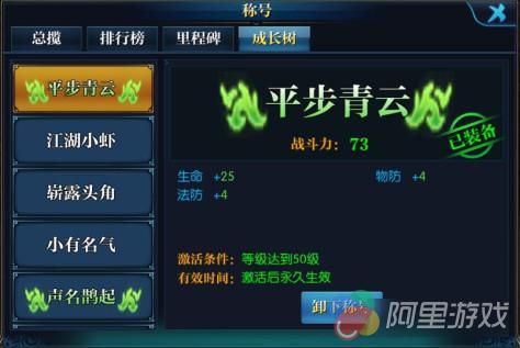 称号分为三大种类,分别为排行榜称号,里程碑称号以及成长树称号。其中,成长树称号最好获得,主要获得途径与等级,装备,战斗力有关,玩家前期变可以通过等级称号过渡。
