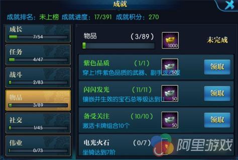 物品成就:物品成就包含玩家坐骑等级,技能,玩家武器装备的品质,玩家身上装备的品质和星级,淬炼等等,宝石,卡牌组合激活,和集齐所有套牌