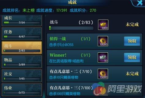 战斗成就:战斗成就是和玩家击杀boss数量,国战击杀其他玩家次数,国战胜利,完成多杀以及比武场排名,甚至是玩家死亡和复活也算在内。