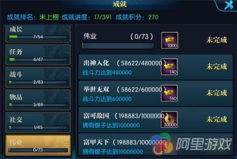 伟业成就:伟业成就涉及到金钱战力境界等成就目的,也是最难完成的成就类别。