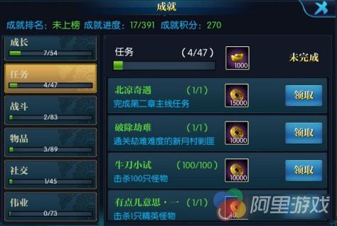 任务成就:任务成就要求多半是玩家击杀精英怪物数量,击杀怪物数量,完成日常,副本,主线,帮派任务程度