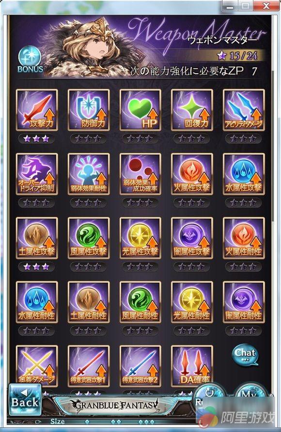那么根据上方的图以及对这个游戏的体验,不用多少,当前版本的主点自然是攻击力,HP,DA确率(二连攻击概率),奥义伤害上升;以及根据职业编成中武器的种类来确定是点得意武器1还是得意武器2(战鬼双得意武器加成)。