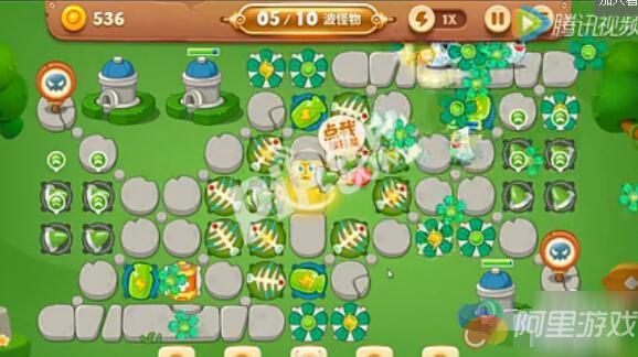 鱼刺的作用就是不仅可以清理障碍物,还能让怪物停顿一会哦,然后差不多前面5波的怪物都是比较简单的,后面开始基本上怪物都是大BOSS,所以需用到的炮塔也是比较多的,所以我们就不断的种上鱼刺,还有可以用的炮塔就可以了呢,如果后期觉得压力太大就用上潜水员的大招吧。