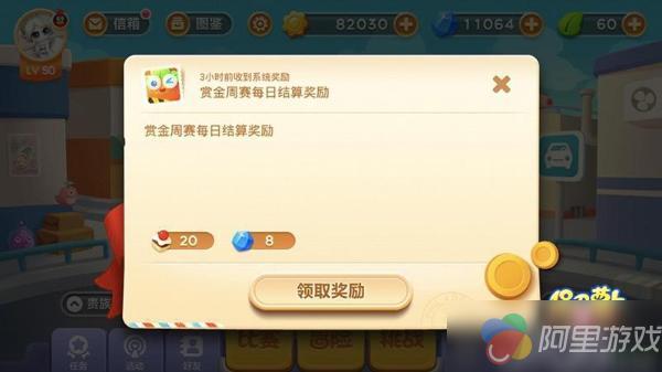 糖果赛:每次挑战可获得金币、经验奖励。每周结算排行榜,根据排名发放一次奖励,仅前三名有奖励,奖励为不等数额宝石。