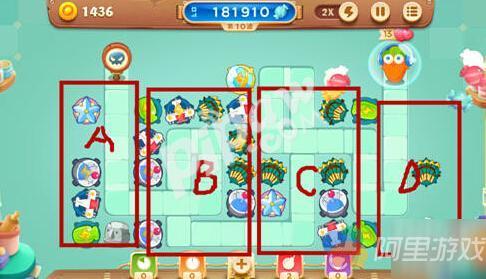 我们最好能建设四段梯次式的攻击区,分别为ABCD四个区,每个区都要配备减速、高攻、范围、单体这四种炮塔。在消灭小怪方面,A区和B区为重点攻击区,C区和D区辅助攻击区。在攻击UFO方面,A区和B区为重点攻击区,C区和D区为火力吸引区。大家从图中可以看出,火力大多集中在A、B两区,C、D的战力可以不那么强。毕竟金币有限,我们要学会取舍。