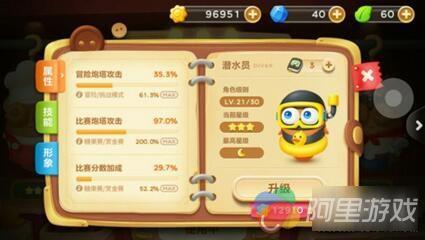 同样21级的潜水员角色的信息就在下图。大家可以看到,21级的牛仔对于比赛炮塔的攻击加成高达126.3%,而相同等级的潜水员,对比赛炮塔的攻击加成只有97%。相同等级的牛仔和潜水员,牛仔在属性方面是远胜潜水员的。
