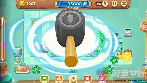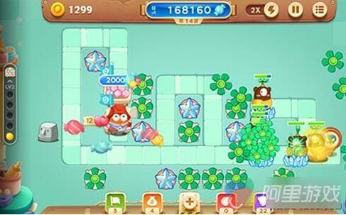亲自上阵的建筑工人阿波,可以说携带了一个全屏晕眩技能,这对各位萝卜丝在后期的糖果赛中有着极佳的帮助。大家也不要忘了【一锤定音】同样具备有伤害的哦,虽然攻击力不算高,但清除一些漏网小怪也足够了,大家要合理安排释放技能的时间哦!有了这么一个技能,我们在炮塔的放置策略上就可以有所改变,在比赛前期,大家可以把炮塔放置得更加密集,让输出更加集中,就让【一锤定音】技能来补漏吧!