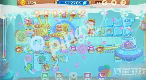 有了潜水员,阿波总算有信心在糖果赛中获得高分了。前十波怪物血量较低,炮塔很容易就把怪物清除干净。接下来,只要减速炮塔和攻击炮塔合理搭配,10—20波的怪物也不是什么大问题。困难的地方在于每10波就会出现的UFO,随着波数增多,消灭UFO的难度也会越来越大。到了第20波,第二只UFO出现时,阿波就要使用潜水员的角色技能【潮汐之力】了。