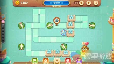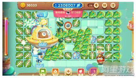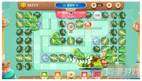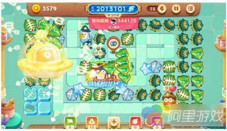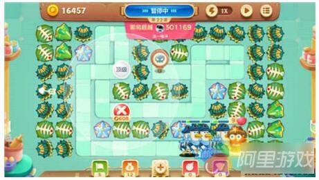 有惊无险,阿波到了4号UFO。暂停,保留4颗冰冻星,将道路两边的炮塔全部换成鱼刺,外圈种上导弹,这样既能拖延道具回复时间又可以对UFO进行有力地打击!