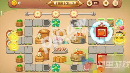 风扇在攻击怪物的同时也会清理障碍物。到了第8波,风扇已经把左下角的大障碍物清理掉了。在空出来的地方放上一个毒气瓶。毒气瓶是范围攻击,就让它在打怪的同时顺便清理障碍物吧!阿波的防线还是很稳固的,接下来的几波小怪都被阿波顺利消灭了。到了第11波,在出怪口旁放上冰冻星,给怪兽们减减速。接着,再建造一个毒气瓶。两个毒气瓶清理障碍物的速度会更快哦~
