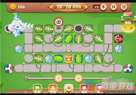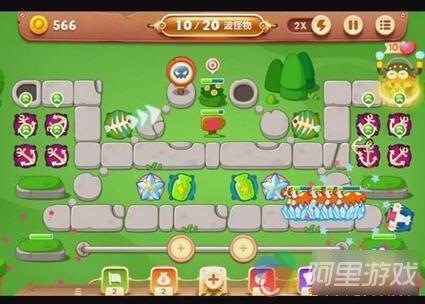 1、开局在右边空地处建造一个鱼刺,并升级满,然后打中间的指示牌,打完后会获得一个瓶子炮。