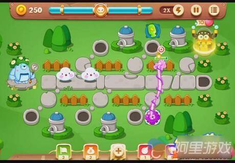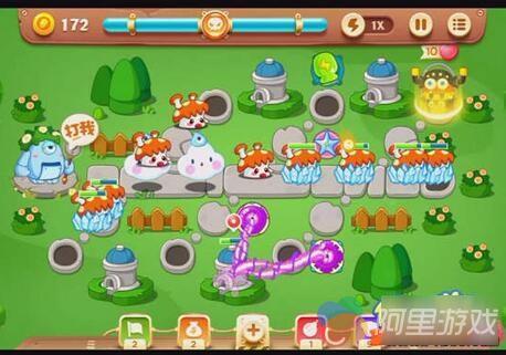 1、开局如图建造满级魔法球和2级的瓶子炮,集火如图所示的栅栏,前面第一波怪先不用怪,等怪到魔法球的位置再转火怪物。