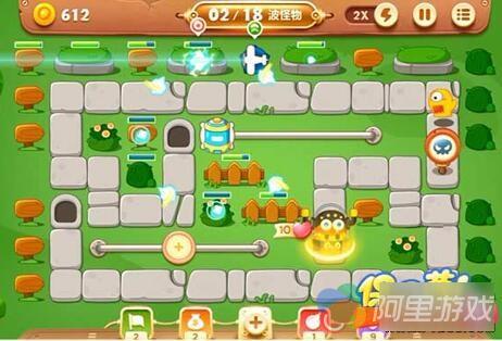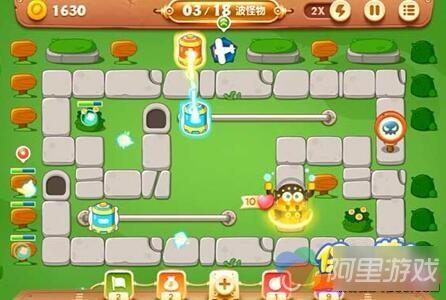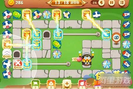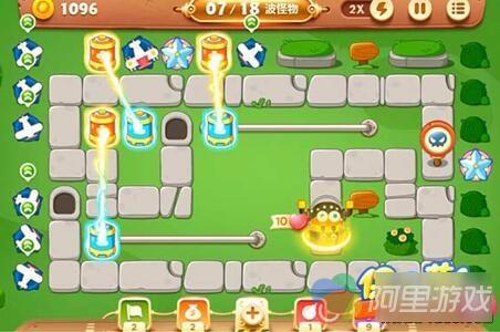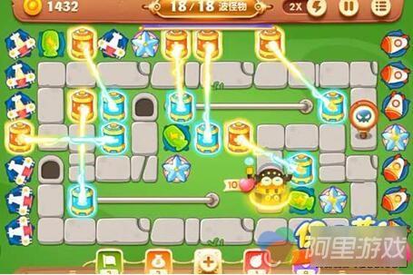 1、游戏开始现在上方滑道放上一个负电塔,兵拖到左侧,利用它的范围攻击清理周围的道具。
