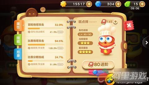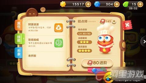 糕点师是四星角色,需要经过两次进阶才可升为满级。属性方面,冒险炮塔攻击加成为41.3%,比赛炮塔攻击加成为128.2%,比赛分数加成为31.8%。虽然糕点师的各项数据比起潜水员和牛仔来说有点不够看,可对于新手萝卜丝积攒经验来说,糕点师绝对是一个绝佳的选择!