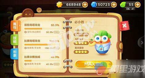必小胜是阿波遇到的最省事的角色啦,从一出生就是四星角色,不需经过任何进阶。不过,四星的必小胜在到达满级时还是有40个阶梯需要爬的呦。而想要成功爬上阶梯的顶端,那各位萝卜丝可要好好玩抢夺宝箱和比赛模式啦,毕竟每上一层阶梯就需要更多的金币。虽然必小胜不需要进阶,但它的实力可一点都不容小觑呦。哎,阿波怎么发现必小胜有点像阿波的男神张继科呢,一睡一醒,实力马上就不一样了。初始阶段的必小胜冒险炮塔攻击为13.0%,比赛炮塔攻击为22.0%,比赛分数加成为12.9%,看起来还是有点弱的。不过在升至满级后,各项数据都有了大幅度的提升,冒险炮塔攻击提升为50.3%,比赛炮塔攻击提升为150.0%,比赛分数加成提升为40.3%,就攻击方面可以说是相当的不错,几乎可以媲美潜水员了,是不是感觉到必小胜的厉害了呀!