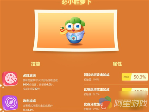 至于必小胜战斗力表现!在糖果赛中,150%的攻击加成让炮塔们火力十足;而【必胜满满】一出,无论多嚣张的小怪都得乖乖被眩晕。手拿披萨的必小胜用它的属性和技能掌控着战斗的节奏,看上去有那么一丢丢帅气哦~