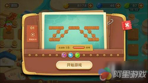 2.先在上图左侧位置放1个冰冻星和1个船锚,右侧放瓶子炮和2个船锚来攻击救生圈障碍物,渐渐获取新的免费船锚。