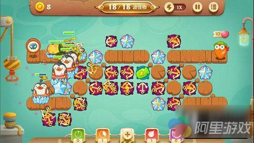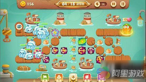 3.在怪物轨道中间的2个空隙处放冰冻星减速很关键,之后就是建更多的船锚,怪物没来时就攻击障碍物,渐渐就会积累很多金币。
