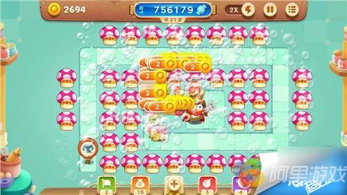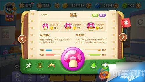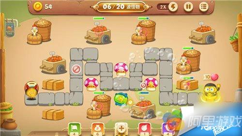 蘑菇的攻击方式是向四周无死角的辐射泡泡,而这些泡泡能把小怪物圈在里面为阿波打工,顶级的蘑菇每攻击一次小怪物便能生产2个金币。不仅如此,小怪物进入泡泡后会变小,相应的腿也会变短,速度就变的慢吞吞的啦!