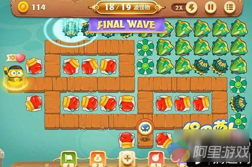 2、把中间的那个炮塔清除干净后,在中间放满拳套,右下角放置一个风扇,继续清理其他位置的障碍物,并且消灭怪物。
