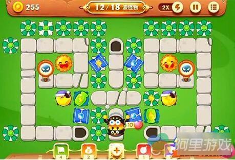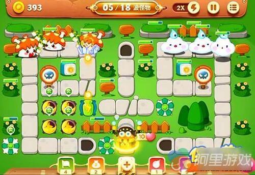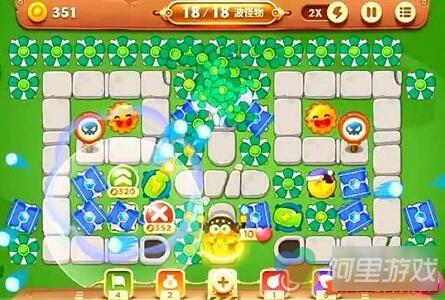 3、接下来几波就是赚金币的时候,可以开始建造冰锥和风扇,加大自己的火力输出。同时大部分的障碍也是可以清除掉,右侧的四个月亮同样是留一个即可。