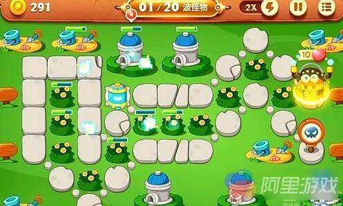 4、最终的布局如下,没什么大的改变。主要还是利用正负电塔的强大火力加上冰冻星的减速,还是比较稳的过关的。