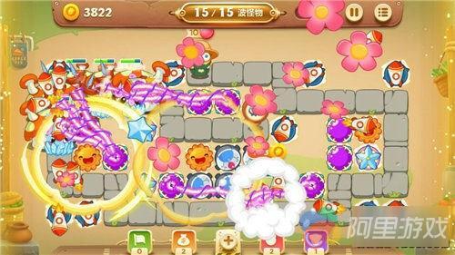 萝卜丝们可以在第1-3波这个时间段内,先将太阳花放置在出口下方,一边清理道具,一边攻击小怪物们,真是一举两得。然后将冰冻星放在道路转折处,减缓怪物移动速度。最后将火箭在道路周边进行辅助攻击。在怪物出没的间隙快速点击道具清理来增加金币储量,在初期尽可能多的扩展炮塔。