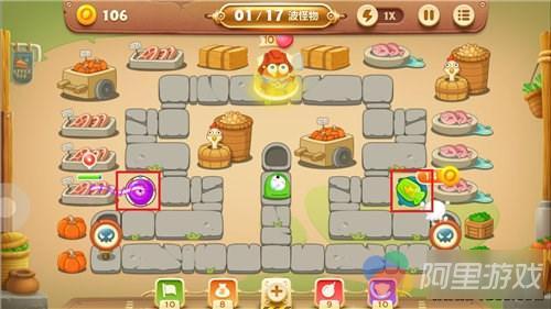 系统非常吝啬,开局只给阿波1000金币,阿波用这笔钱在地图两边建造了魔法球和瓶子炮。瓶子炮用来消灭小怪,魔法球则用来清除障碍。