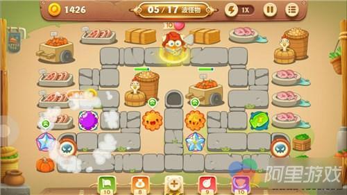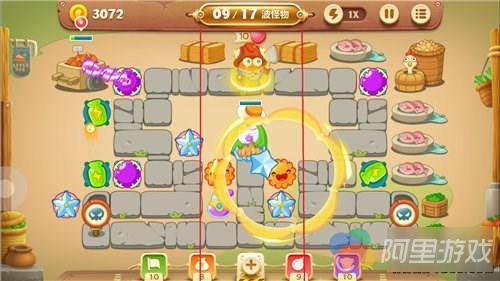 别看只有瓶子炮在打怪,对付前4轮的小怪依然绰绰有余。到了第5轮,当魔法球打掉左下角的南瓜后,阿波可以开始排兵布阵了!在地图左下角和中路放上冰冻星星,让怪兽变得慢吞吞的。中路上方两个空位则留给太阳花,让它们一边杀伤敌人,一边给中央的障碍带来持续伤害。