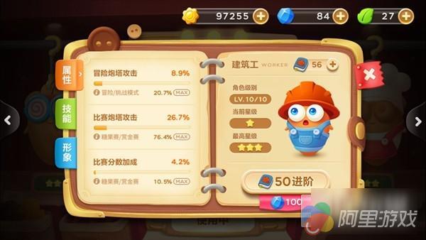 与画面的立体相呼应的是本作中新鲜登场的试衣间。在这里,玩家可以给萝卜换上符合三个副本主题的衣服,当然首先你需要集齐装扮所需的碎片,目前商店里有红头巾、工人、烹饪师、潜水员等装扮,星级越高,效果加成越强,所需要的碎片就越多。当外观改变之后,萝卜还将获得不同的特色技能,属性也有所改变,甚至能够通过消耗金币和一些特殊道具为它升级,以获得金币、分数以及炮塔攻击的加成。