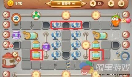 如图,上面2个隐藏炮塔为风扇,下方两边各两个减速,非常有用,下方滑竿建议建造3个汽油瓶,来回移动在减速附近,可轻松过关。
