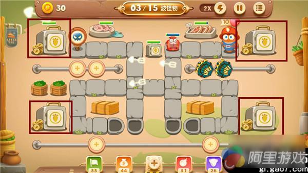 1、图中四个红色方框处,隐藏着几个蘑菇塔,蘑菇塔可以减缓怪物行进的速度,所以这是必拿的。所以,可以在如图所示位置,建两个多重箭,在杀怪的间隙,打右下角的宝箱。