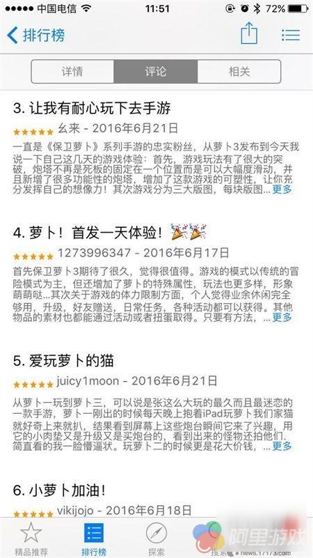 游戏上线一周以来,无论是下载量还是五星评论,都呈爆发式的疾速增长。在一周时间内,《保卫萝卜3》占领排行榜第一的位置丝毫不受动摇,并且霸榜势头有增无减,评论量每天都在高速刷新,一周评论量高达数千条的APP,在手游市场可不多见。
