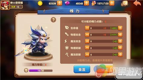 当英雄达到橙色5星时,无法再提升星级,魄力功能开启,每获得30魂石提升魄力等级1级,魄力没升1级就可获得3点属性分配,由玩家自由分配英雄的属性点。