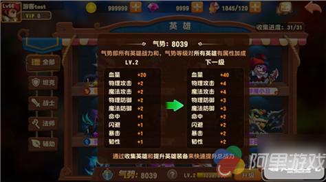 4、 提升气势等级,气势等级靠所有英雄总战力提升,气势等级的提升会提升所有英雄属性。