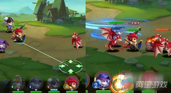 在操作上,玩家皆可随意控制上场英雄控制的位移和两种技能(范围性攻击和必杀技)。长按下方英雄头像,拖到目标处,即可调整角色的位置;当头像内小圈的进度条满后,重复前面的操作,就可以对指定的目标或区域发动小范围的攻击。