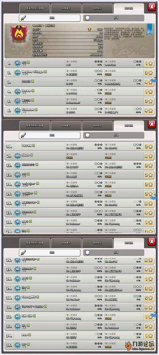 昨天下午一开战,双方轮番进攻,战星相差无及。但双方九本都没有三星胜利。开战一个多小时后,我方副首stevedon17和攞你命三千接连打出两个九本三星后,极大的鼓舞了队员的士气,随后,我方三星胜利不断增加,对方却基本还是延用石法流的保二打法,看到这样打法的时候我们就知道这场部落战我们赢定了!为此部落战,对方走失三人。。。。。。。